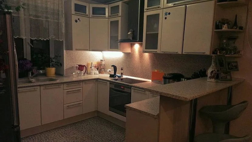 Любимое многими новшество – подсветка фасада снизу. В этом случае создается ощущение парения кухонных столов, чего-то мистического и романтического одновременно. Особенно это выглядит эффектно в темное время суток.