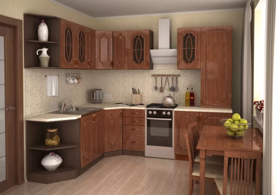 - Некоторые кухни в углу имеют особенности – выступ, газовую колонку, вентиляционную трубу внутри колонны. Стандартная мебель для них не подходит, требуется изготовление на заказ.