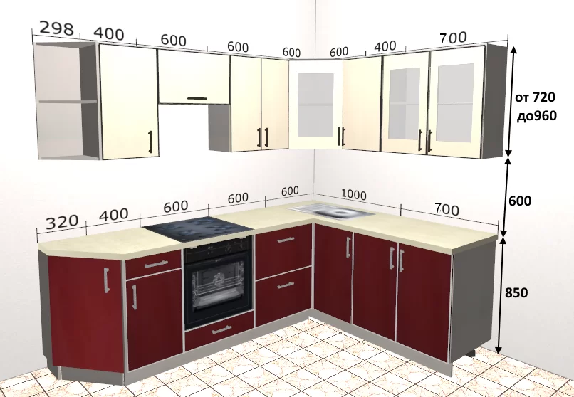 Самым важным моментом при проектировании такой угловой кухни является определение высоты рабочих поверхностей