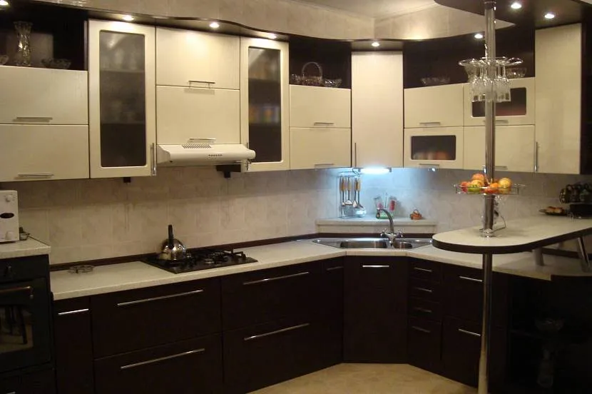 - Площадь помещения. Угловая кухня подойдет для любых кухонь. Однако в малогабаритных помещениях комплект мебели следует дополнить барной стойкой. Это многофункциональный элемент, который подойдет в качестве зоны для обеда, приготовления пищи, приема гостей, чтобы выпить по чашечке кофе.
