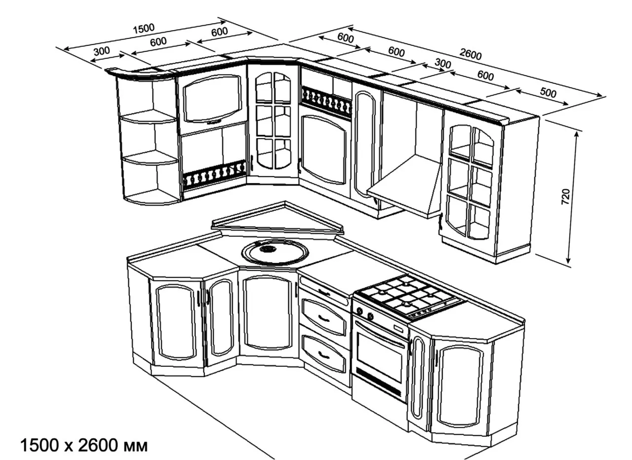 Для того, чтобы не ошибиться с замерами при составлении чертежей угловых шкафов, необходимо сопоставлять их с подробным эскизом кухни.