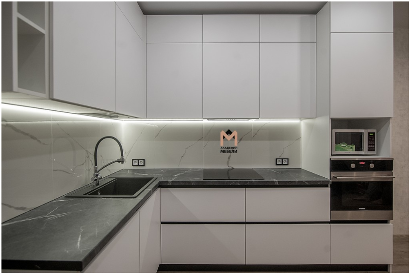 - Можно установить много шкафов различного назначения. Есть место для встроенной техники, вместительных и небольших полок. При этом угловой кухонный гарнитур занимает мало места, сохраняет пространство для других предметов мебели.