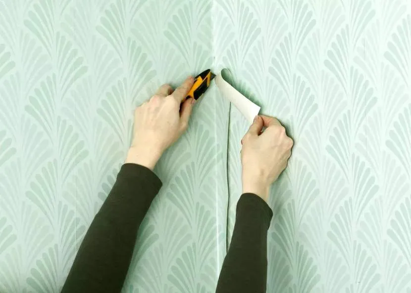 В остальных случаях применяется техника прорезания двух полотнищ. Чтобы шов был аккуратным, стоит прижимать обои во время раскроя жестким ровным приспособлением. Это могут быть штукатурный шпатель, широкая металлическая линейка.