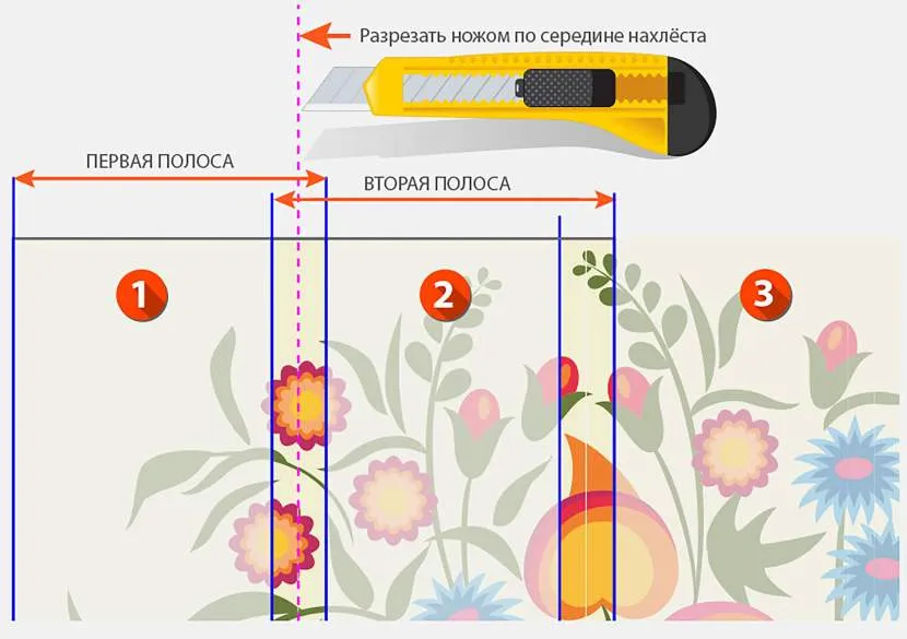 Чтобы ровно обрезать полотно, к нему прикладывают широкий шпатель и по нему аккуратно ножом выполняют подрезку. Изделия с рисунком вымеряют сразу, тщательно подгоняя узор, и излишки отрезают, чтобы не перепутать расположение орнамента. Так как полосы клеят встык, перед фиксацией следующей полосы кромку предыдущего полотна клеем не намазывают.