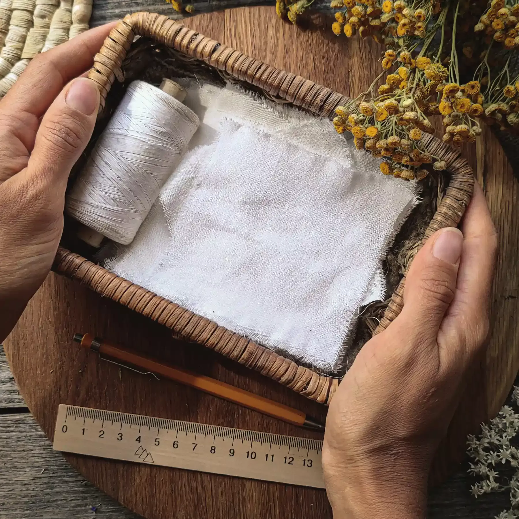 Для оценки насыщенности цвета и тестирования различных временных интервалов в процессе окрашивания нам потребуются небольшие образцы ткани. Эти образцы помогут нам определить, какое количество времени требуется для достижения желаемого цвета. Лично я предпочитаю использовать хлопковую ткань и нарезаю ее на квадраты размером 10×10 см. Этот размер идеально соответствует приготовлению пропорций, так как каждый отрезок ткани имеет вес в 1 грамм.