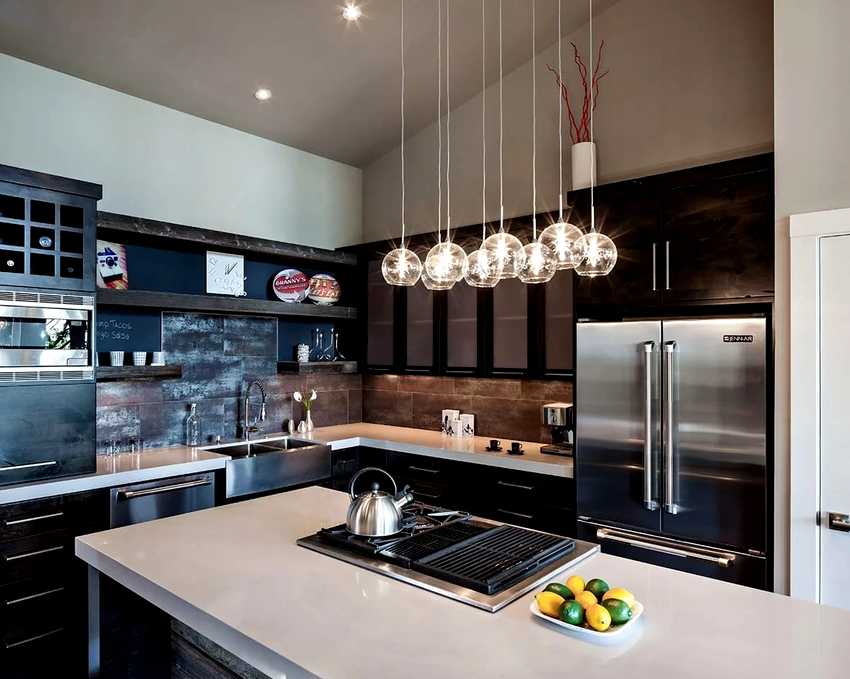 Вытянутые кухонные помещения можно обустроить несколькими свисающими люстрами. Такие плафоны, которые направлены вниз, создают направленный поток для небольшой площади кухни.