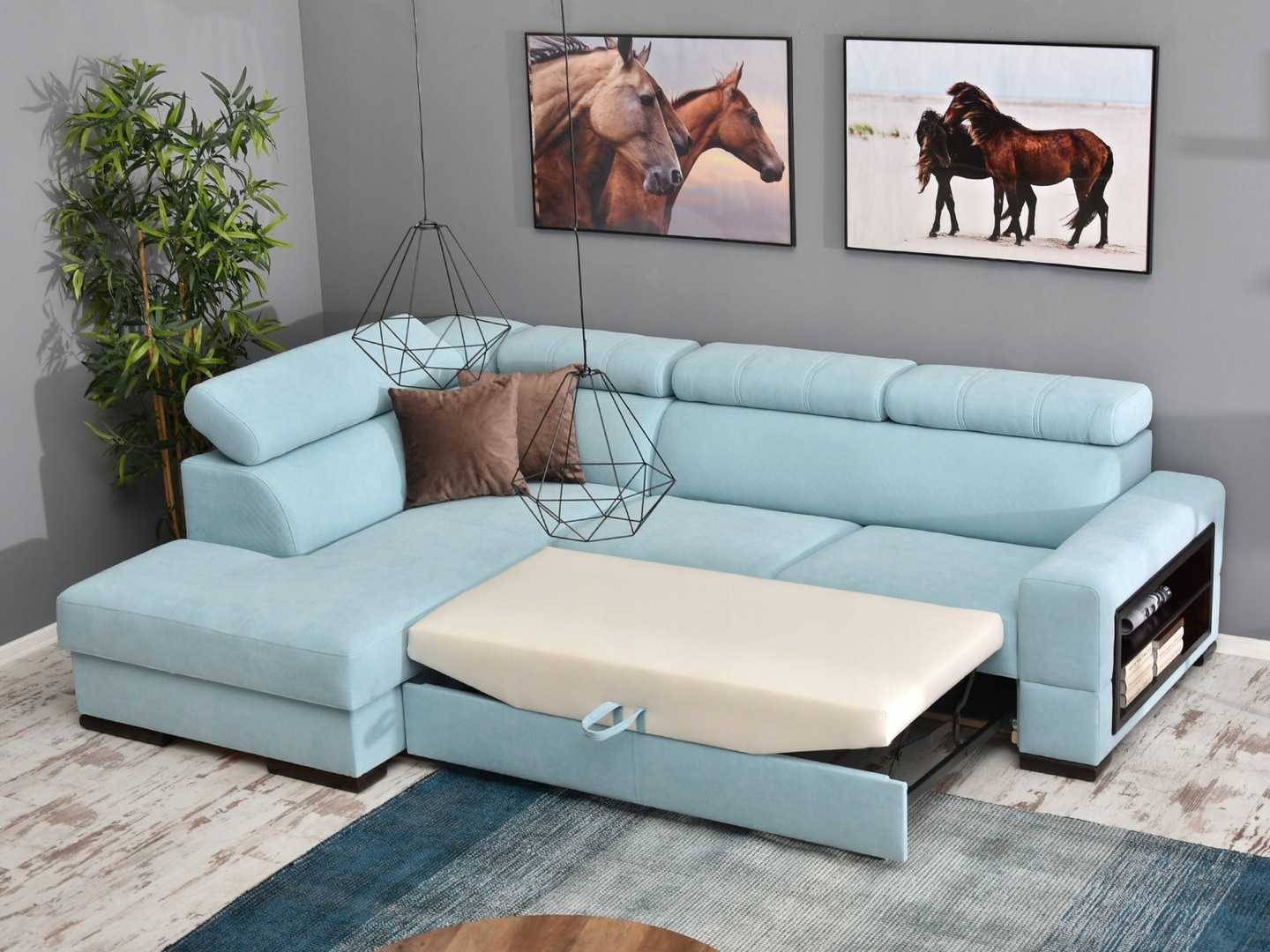 - Угловые конструкции, как правило, достаточно габаритные. Но их можно устанавливать и в маленьких залах, задействовав углы и зону у окна. При наличии свободной площади ними удобно отделить столовую, рабочую и спальную зону.