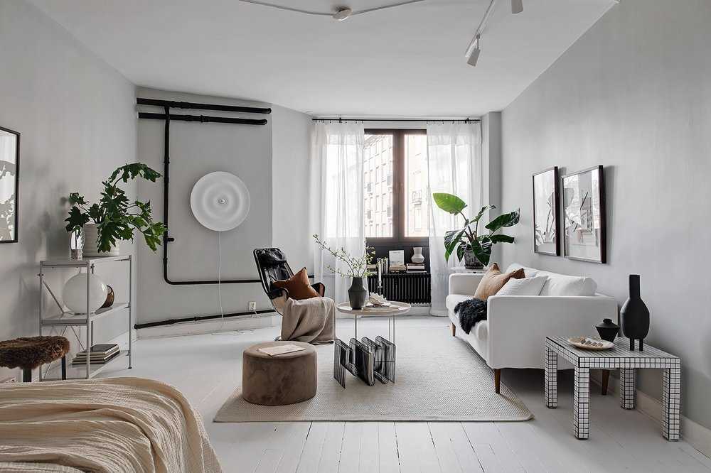 Если помещение маленькое, не стоит покупать громоздкую мебель. Лучше сделать ставку на компактность и отдать предпочтение раскладывающимся предметам интерьера. Например, диван с отсеком для белья будет функциональным и не займет много места. Также расставляйте мебель вдоль стен, чтобы сохранить визуальный простор.
