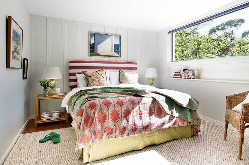 Двуспальную кровать ставят изголовьем к стене или окну (это поможет расставить мебель в узкой спальне), оставляя место для свободного прохода, желательно с двух сторон. При расположении спального места около окна необходимо предусмотреть защиту от возможных сквозняков.