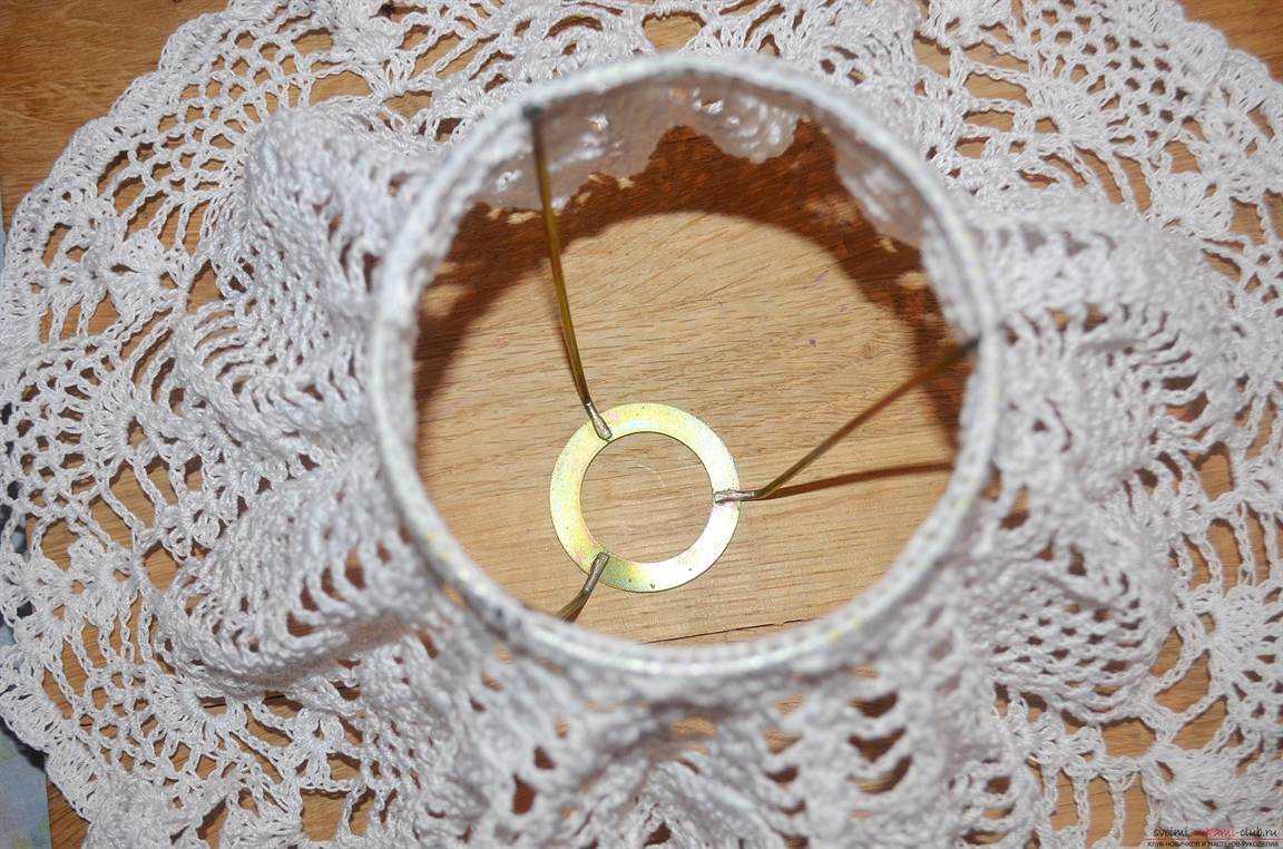 Можно сделать кружевные цветы, полоски или полностью обклеить абажур из ткани кружевными салфетками.