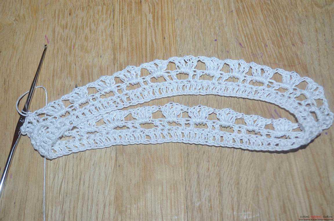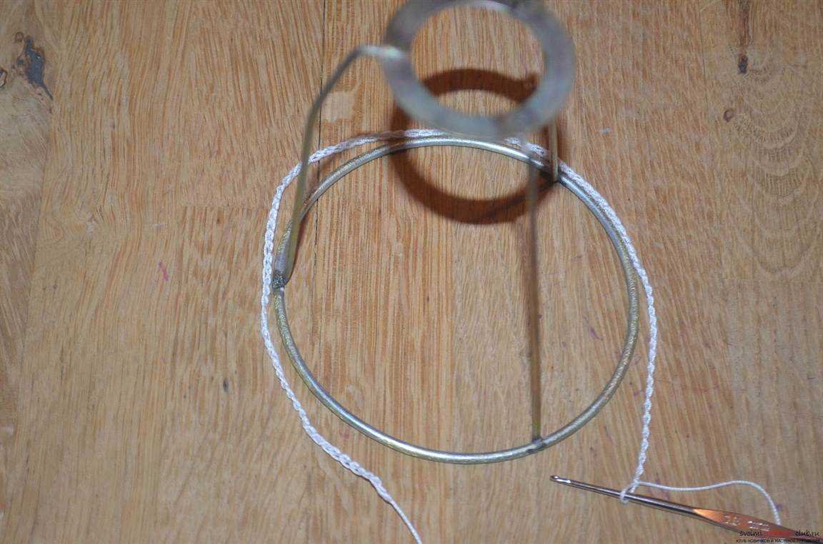 3. К филейной сетке обвязываем дополнительную планочку, чтобы замаскировать проволоку другого цвета. Завязываем нитку с двух сторон, крепим к основе, соединяем ячейки по кругу и сшиваем между собой.