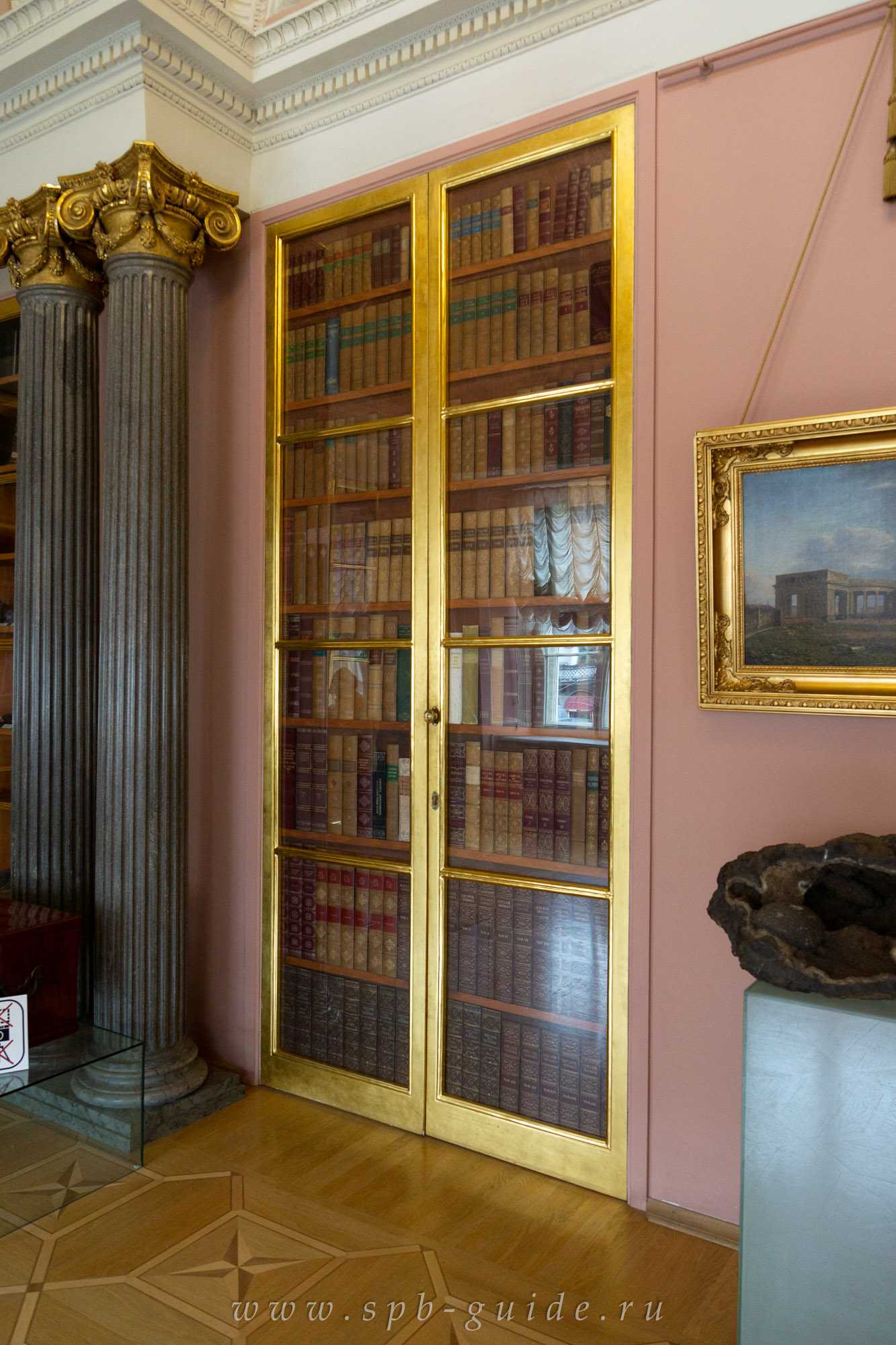 - Является продолжением стены – если дверь вмонтирована в стеллаж или книжные полки, то на ней располагаются полки; если она является частью стены, то на ней будет та же отделка: молдинги, плинтусы, лепнина.