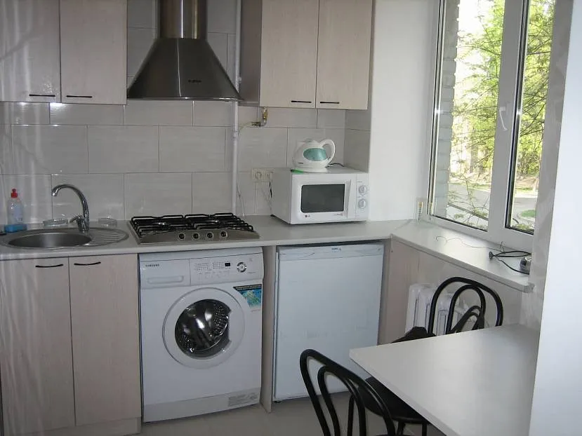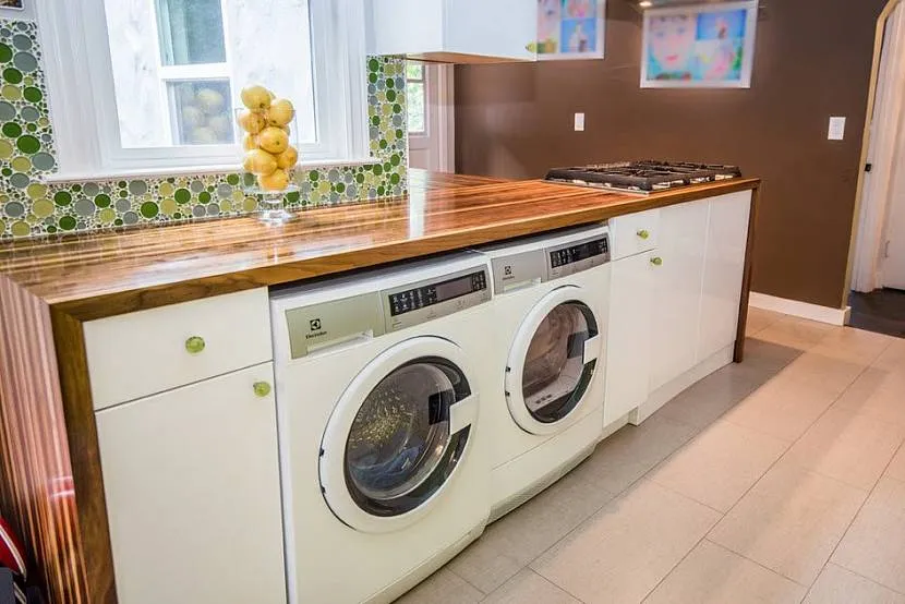В случае если ванна комната маленькая, нет места для установки бытовых приборов, то оптимальным вариантом станет кухня. Но при установке на кухне стоит выбрать то место, где она не будет занимать много места. Лучше установить ее в нишу, если она конечно есть. Если такого места нет, то можно встроить технику под столешницу, прямо в кухонный гарнитур.