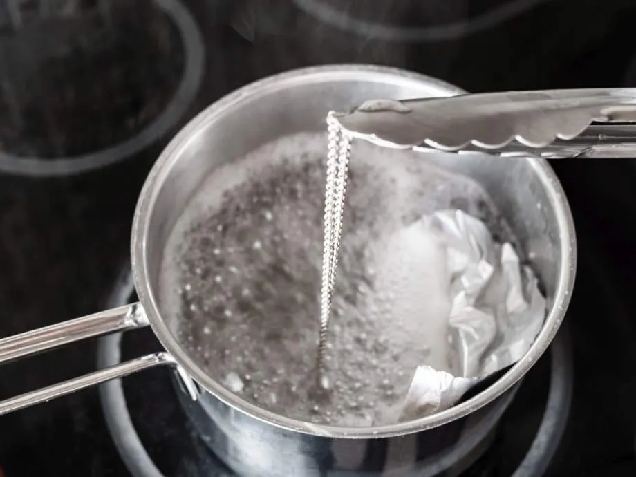 Этот вариант обработки украшений позволяет быстро убрать тусклость и потемнения. Кроме того, таким методом можно очищать не только ювелирные изделия, но и посуду. Только нужно следить за тем, чтобы на украшениях не было драгоценных камней.