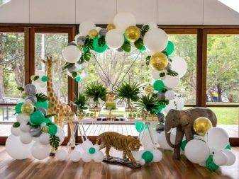 Для оформления помещения понадобятся искусственные растения (для создания густых зарослей), фигуры в виде диких животных (единорог, лев, слон и прочее), тематические воздушные шары. Также можно подготовить одежду и игрушечное оружие для искателей приключения. Такая идея подходит для детей любых возрастов. Украсить стены можно при помощи крупных зеленых листьев, вырезанных из цветной бумаги или картона.