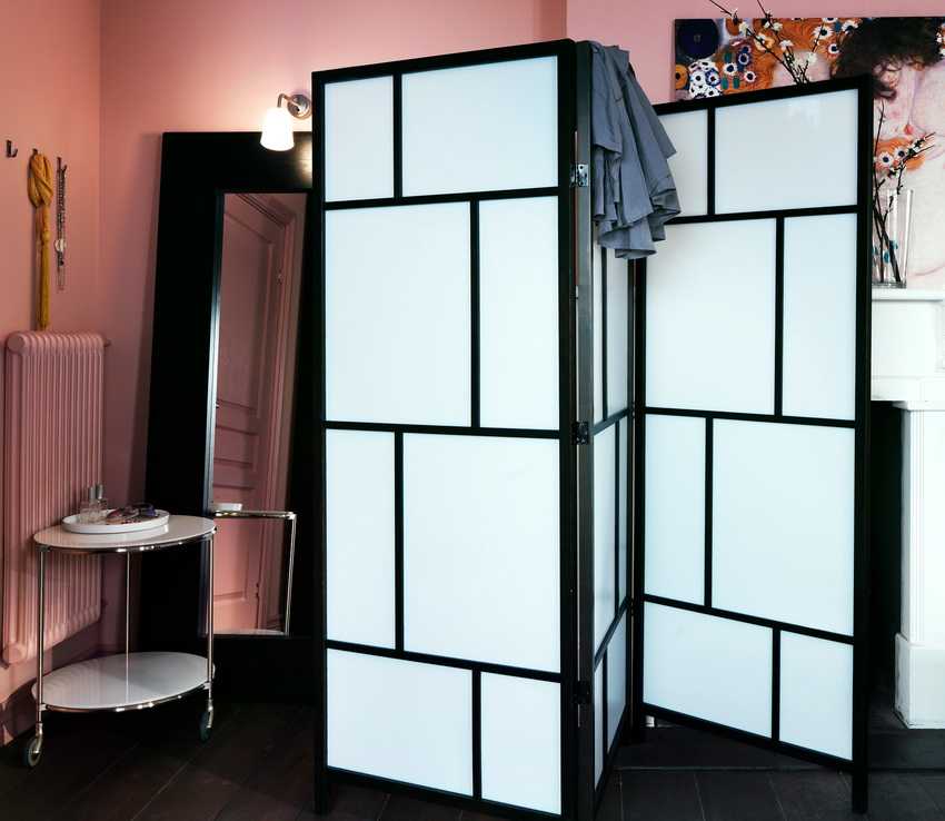 Классические модели ширм состоят из трех отдельных секций, соединенных между собой петлями и складывающихся по типу гармошки. Каркас створок обычно выполняют из легкого материала, такого как дерево или пластик. Для наполнения используют текстиль, кожу, плотную бумагу, бечевку, поликарбонат и другие материалы. Такие заставки отлично работают в качестве разграничителей жилого пространства небольших по площади комнат.