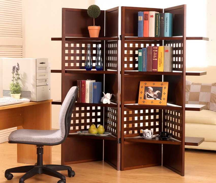Универсальные ширмы- с полками или карманами могут одновременно отделять одну часть помещения от другой и выполнять роль стеллажей и полок. Учитывая предпочтения, в карманах и на полках таких заставок можно расположить книги, статуэтки, вазы и другие декоративные вещицы. Если такой ширмой прикрыть место рабочего стола, карманы используют в качестве пеналов для канцелярских принадлежностей.