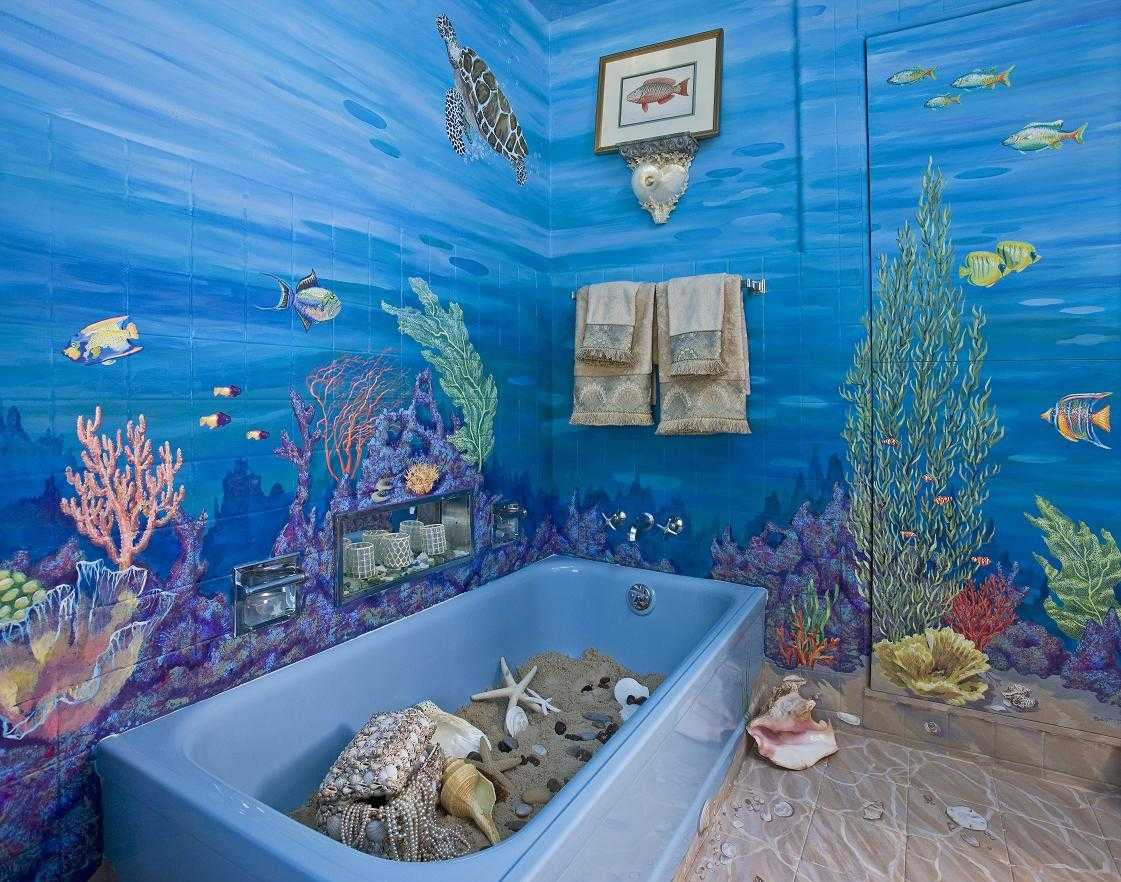 Часто стены в ванной отделаны кафельной плиткой. Если на фрагментах есть фактурные узоры или красивые картинки, то украшение для ванной можно не подбирать. Ну а когда кафель однотонный, помогают стикеры, виниловые наклейки и другие картинки, продающиеся в магазине сантехнических изделий. Наклейки имеют различную форму, расцветку и размеры. Изготавливаются изделия из влагостойкого материала и просты в нанесении.