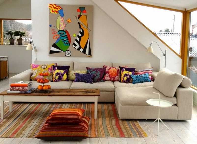 Чтобы комната не была однотонной, расставляйте акценты с помощью подушек, занавесок или ярких ковров. Так помещение будет выглядеть более ярким, уютным и позитивным.