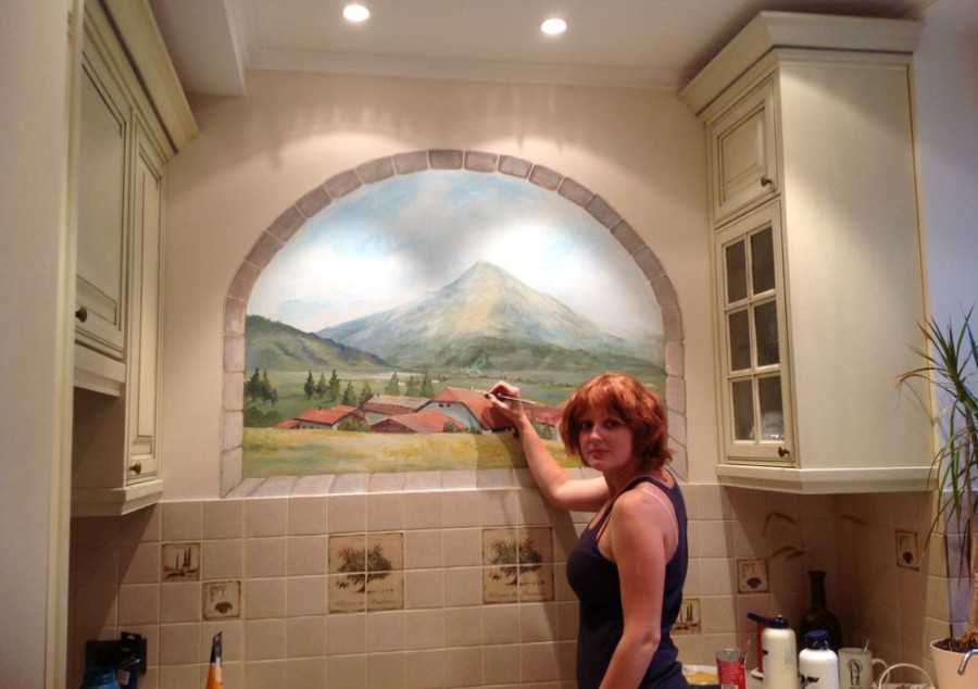 - Вертикально ориентированные рисунок на стене, к которой примыкает рабочая зона. Самая загруженная часть кухни – это именно рабочая зона. Поэтому ее следует облегчить покрытием с вертикально ориентированным рисунком.