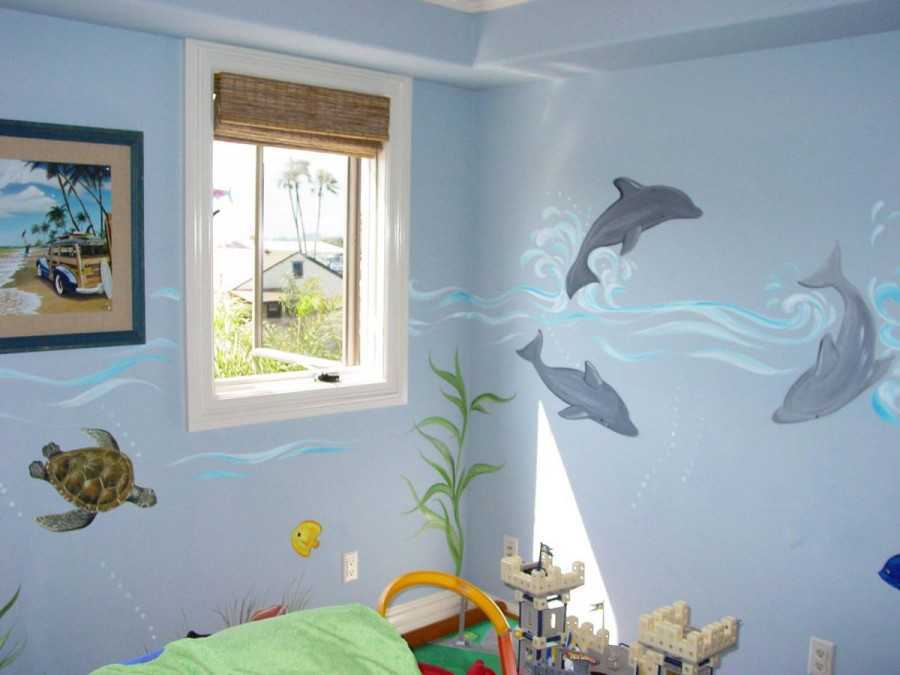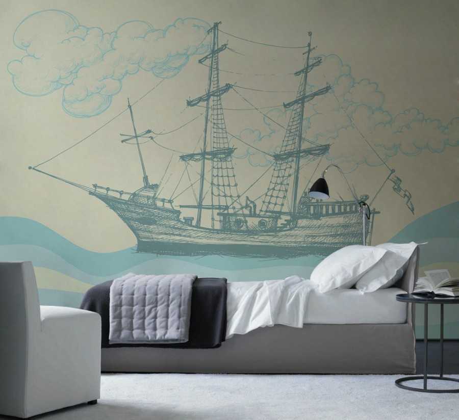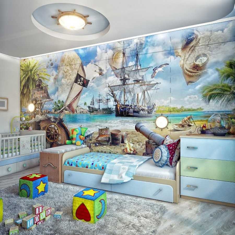 Узоры подбираются по тематическим предпочтениям ребенка. Если он увлекается рассказами о пиратах, то интерьер оформляется в том же духе, с изображенными кораблями и морскими волнами.