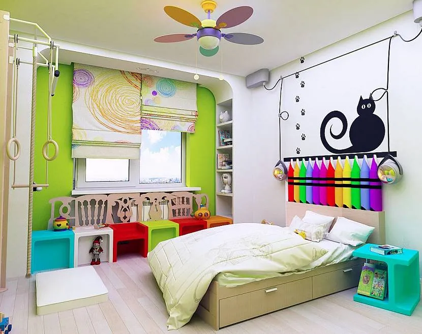 Яркий дизайн. Вопреки опасениям, использование всех цветов радуги и еще нескольких дополнительных не обязательно превратит детскую в филиал цирка. Результат понравится и вам и ребенку, если в качестве фонового выбрать нейтральный оттенок, а ярким сделать декор: подушки, шторы, ковер, мебель. Игрушки органично дополнят впечатление.