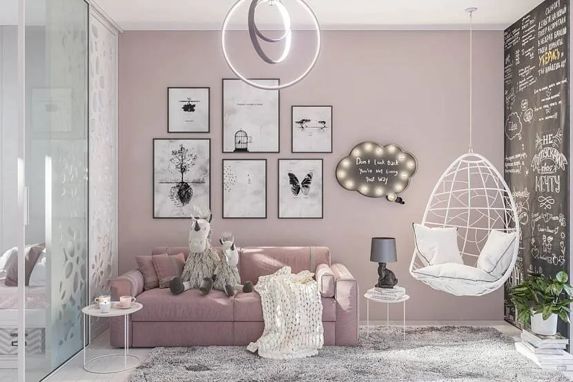 - Розовый. Данный цвет является самым популярным. Оттенок поможет сделать интерьер романтичным и игривым. Но, не стоит выдерживать помещение исключительно в розовом цвете, лучше его комбинировать с серым сиреневым или голубым тоном.