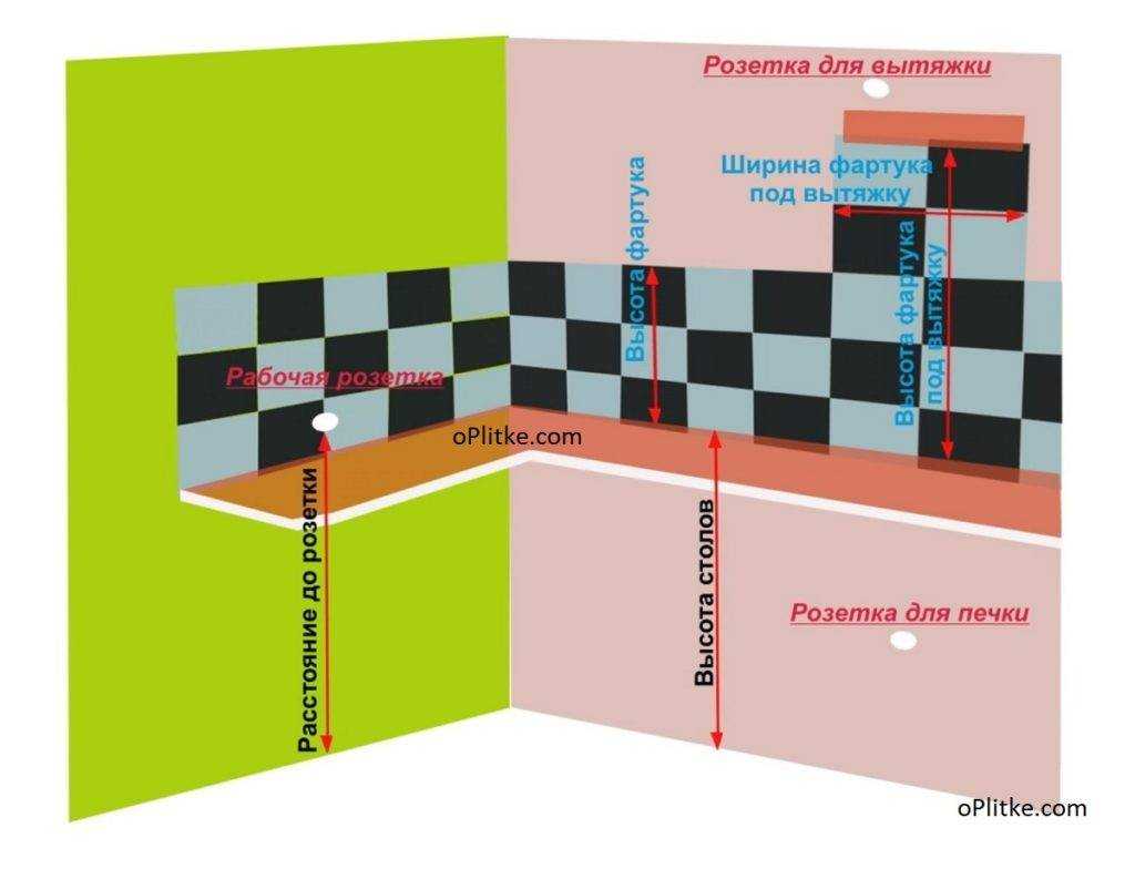 - область, выделенная под фартук, высота потолка, общая площадь кухни;