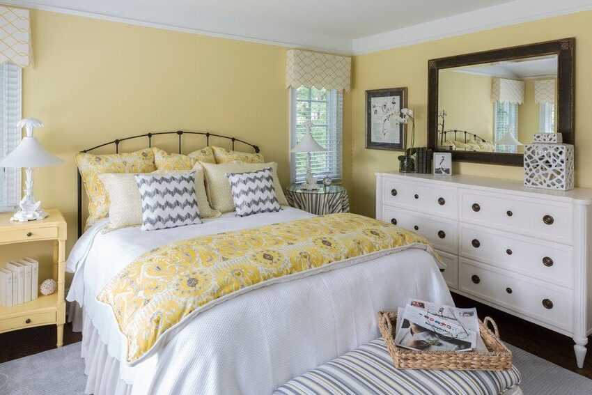 - Желтый – неоднозначный цвет, он повышает жизненный тонус и способствует развитию творческой энергии. Лучшие цвета для спальни – бледные и припыленные оттенки желтого для основной отделки, яркий сегмент – для деталей.