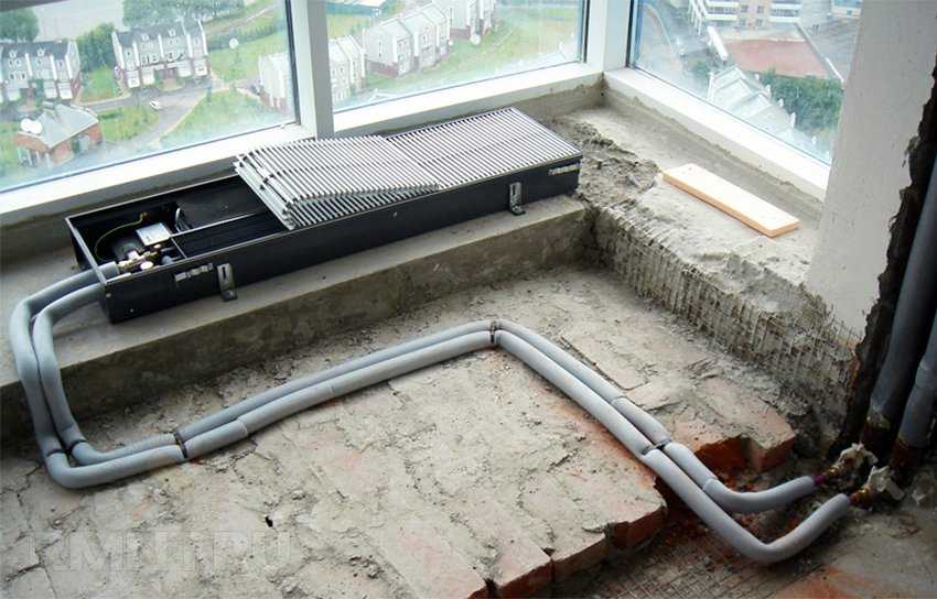 Такие ситуации могут возникать во время производства строительных работ, место установки конвектора должно предусматриваться в период монтажа полового покрытия и системы подогрева. Размеры углубления должны отвечать размерам корпуса с запасом по периметру 2–3 см, длина вывода пластиковых труб должна гарантировать беспроблемное присоединение устройства. Их всегда делают с запасом, излишки по длине потом отрезаются.