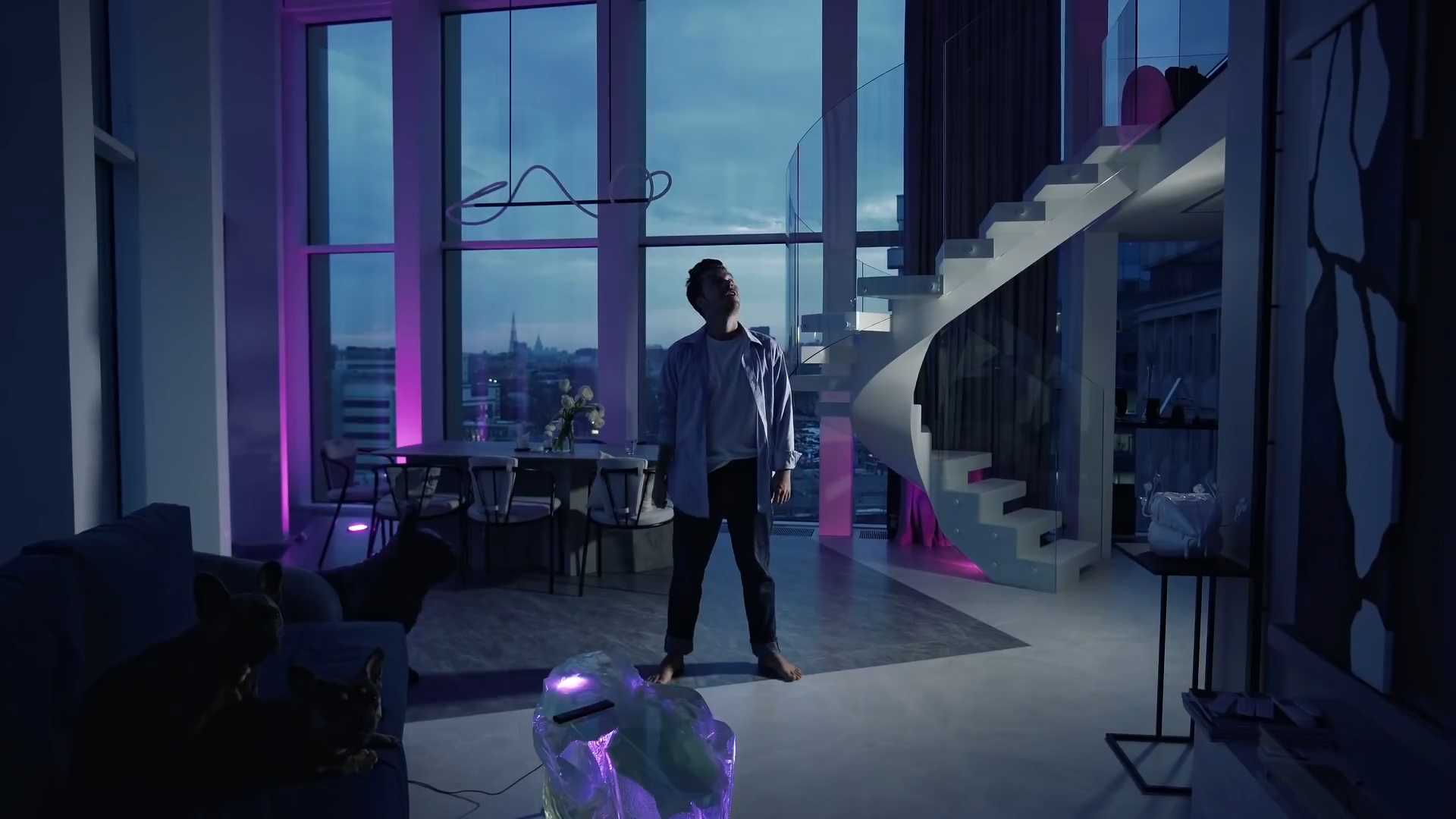 На первом уровне расположена кухня-гостиная. В зоне отдыха разместились мягкие плюшевые диваны, ковёр с длинным ворсом, мраморный столик и полки с книгами, расставленными по цвету. На стенах и потолке декораторы разместили необычные люстры, лампы и яркие абстрактные картины. Также светильники причудливой формы можно встретить на полу. На второй этаж, в ванную и спальню, ведёт лестница с удачно расположенными потолочными креплениями. Благодаря такому крепежу лестница «не съедает» пространство под собой.