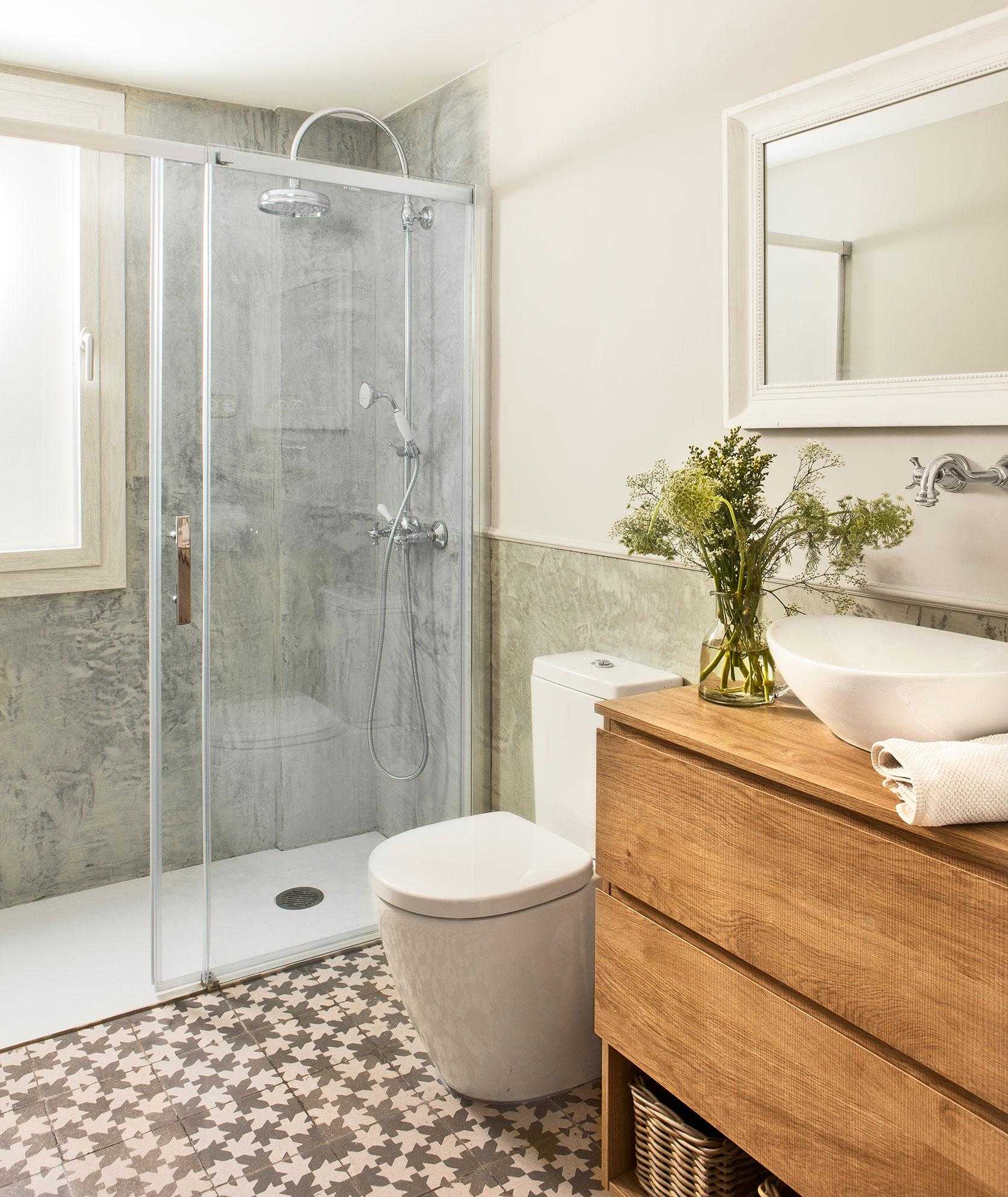 Хороший пример дизайна маленькой ванной: плитка под дерево в мокрой зоне, декоративная штукатурка на остальных стенах. Ошибки 2. Обычный унитаз а не инсталляция. По итогу выглядит не современно, занимает место, виден короб скрывающий отвод канализации от душа, туалетная бумага и другие предметы лежат почти на полу. Установка подвесного унитаза позволила бы скрыть все коммуникации и организовать над инсталляцией нормальную систему хранения.