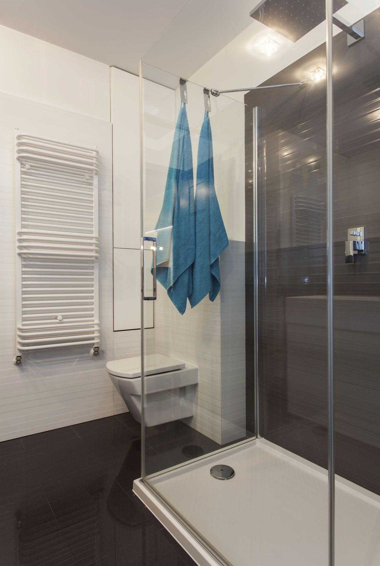 Визуально размер этой ванной уменьшается до границы белой плитки. Для зонирования достаточно отличий в цвете на пару тонов. Нет нужды использовать настолько контрастные отделочные материалы в маленькой ванной комнате.
