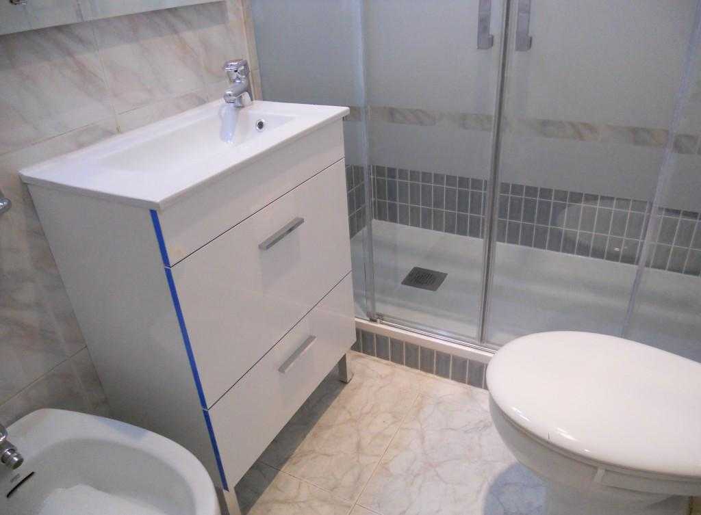 Глянцевая плитка в форме кирпичиков прижилась во всех стилях, ей испортить интерьер нереально. Опять белая глянцевая тумба и шкаф. На полу керамогранит под дерево который не сочетается ни по стилю ни по цвету. Если бы площадь была больше — выглядело бы плохо. Но в небольшой ванной не бросается в глаза. Между шкафом, тумбой и наличником двери нет зазоров. Про последний часто забывают и ошибаются в расчётах.