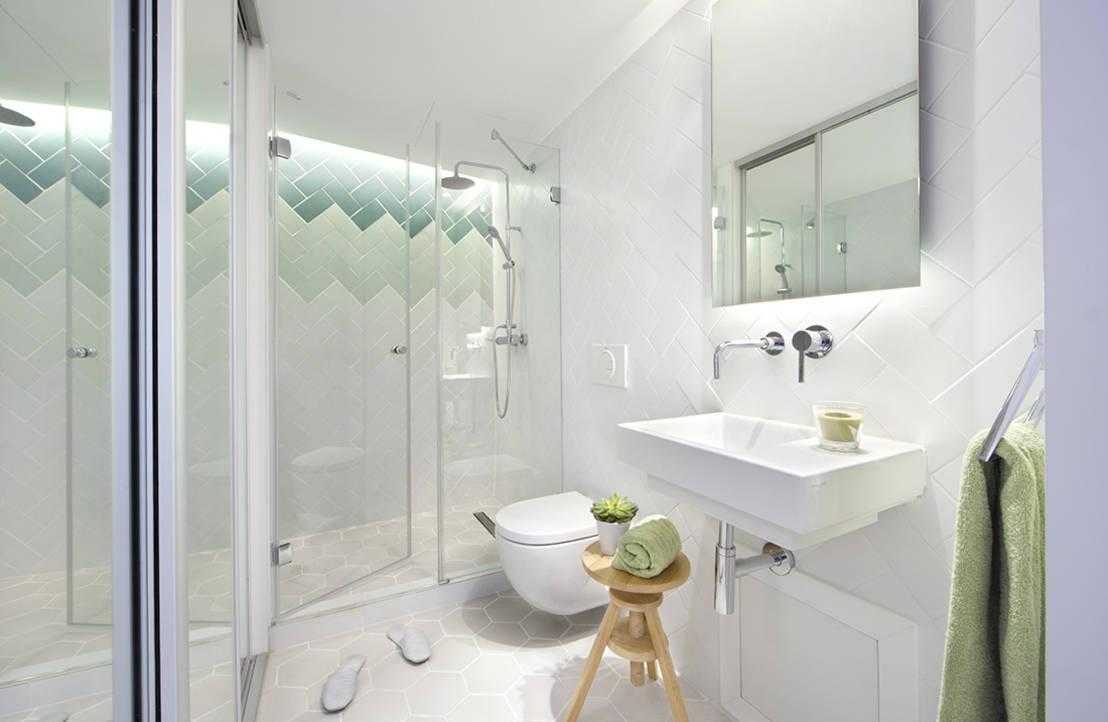 2 примера где реализованы современные идеи дизайна ванной комнаты на очень маленькой площади. Светлые цвета, аккуратные точеные акценты и общая воздушность = красивая ванная.