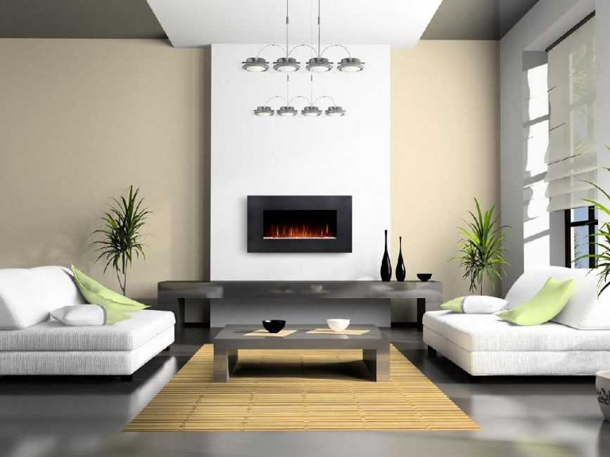 Также будет уместна настенная конструкция, имеющая тонкий корпус из стекла или пластика. Подобное изделие в виде плазменного экрана с имитацией процесса горения, удобно подвешивается на стенку в гостиной, что позволяет значительно сохранить место в комнате.