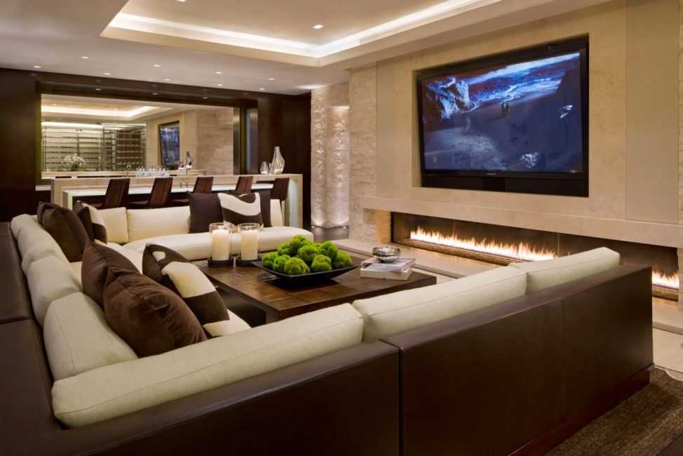 Если гостиная большая, то можно отвести один из её углов под зону отдыха, разместив там телевизор и камин. Оба предмета будут располагаться близко друг к другу, но на разных стенах. Тут же устанавливаются кресла с диваном. Остальную часть комнаты можно оставить для активного времяпровождения, например, танцев, или сделать из неё, к примеру, столовую. На фото представлена гостиная с камином и телевизором, установленных на смежных стенах.