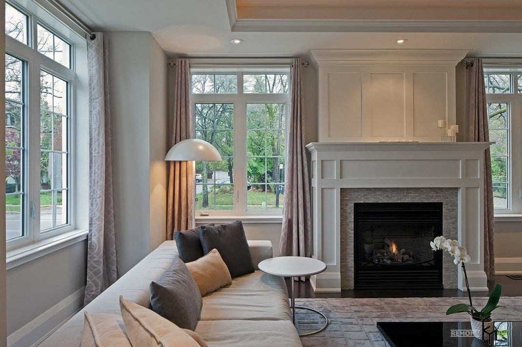 На фото камин, размещенный между двумя оконными проемами в большой гостиной.