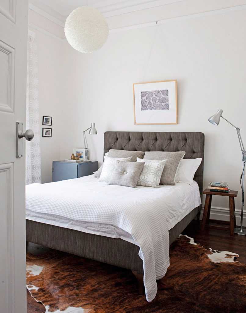 Если зона у изножья кровати используется, например, для переодевания, то ковер можно сдвинуть чуть ниже тумбочек. Но не сдвигайте ковер чересчур низко: на него будет неудобно наступать, вставая с кровати. А слишком маленький ковер нарушит пропорции комнаты.