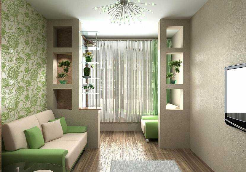 Маленькую узкую комнату можно разделить таким образом: организовать рабочую зону (стол и стул) возле окна, вдоль одной из стен поставить длинный линейный диван с нишами для хранения вещей снизу. В углу возле стола можно поставить деревянную высокую полку. На ней располагают комнатные растения, предметы декора, гербарии, канцелярские принадлежности.