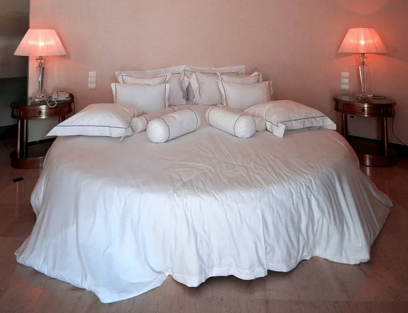 - Постельное белье для круглой кровати требуется такой же формы. Его рекомендуется брать на заказ. Только так можно угадать с размером, качеством материала и расцветкой. Наматрасник на круглую кровать, простыня, покрывало — все это изготавливается из самых разных тканей, вплоть до дышащего сатина или натурального шелка. Комплект для круглой кровати чаще всего собирают по частям, руководствуясь своими предпочтениями. Размеры готовых сетов подразделяются на евро, евро-макси и семейный. В каждом из них, кроме третьего, — 2 наволочки, простыня и пододеяльник. Последних в семейном два.