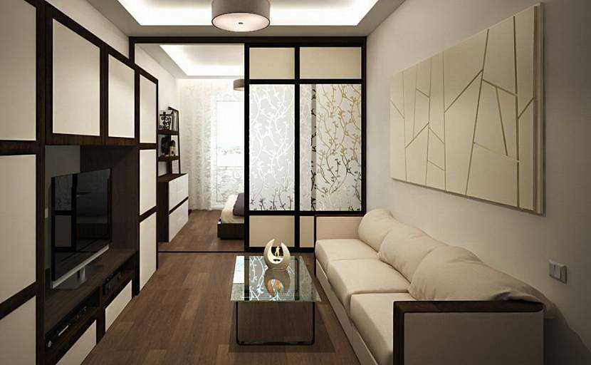 Комната, которая отличается узким пространством обычно делится на две и более функциональных зон. Чаще спальню разграничивают по длине в половину пола. В середине между гарнитуром оставляют «дорожку» для перемещения по комнате.