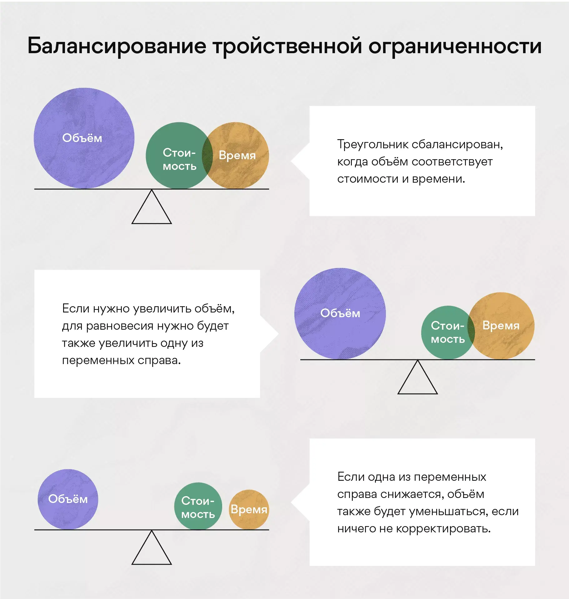 Для того чтобы контролировать все три элемента, менеджер проекта должен иметь чёткое представление о каждой отдельной переменной и возможность гибко реагировать на изменения в рамках всего проекта.
