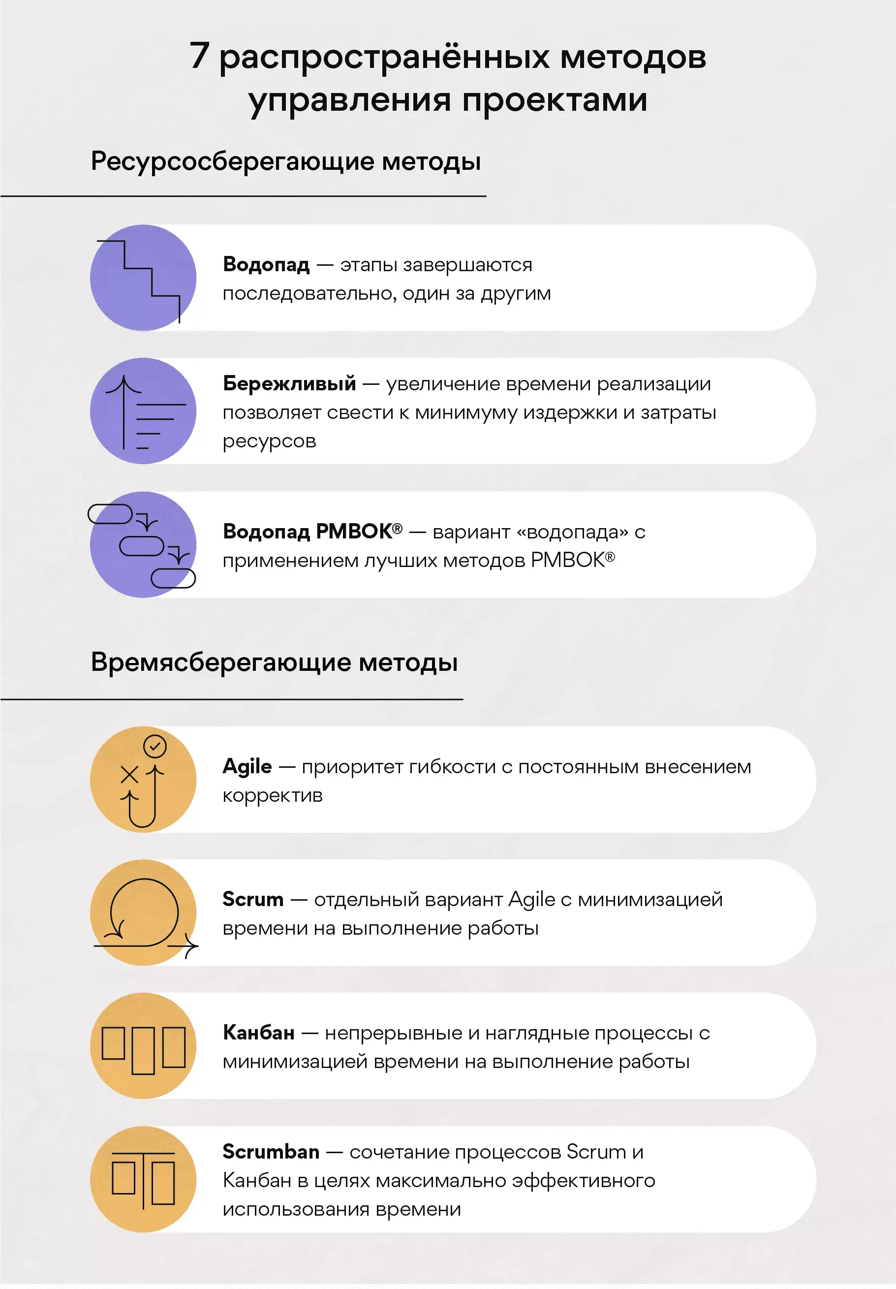 Scrumban: в этом методе коллективные и непрерывные канбан-процессы сочетаются с ежедневным групповым обсуждением по методу Scrum, что помогает эффективнее минимизировать время на выполнение работ.