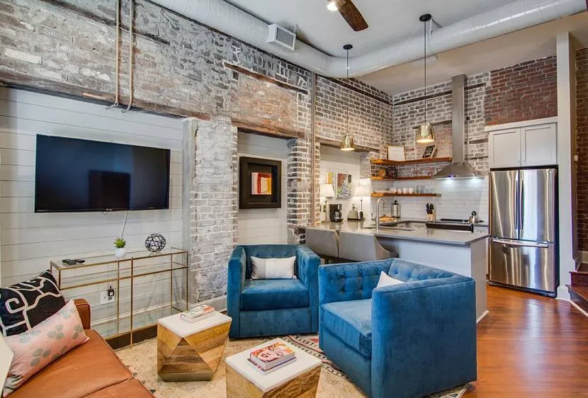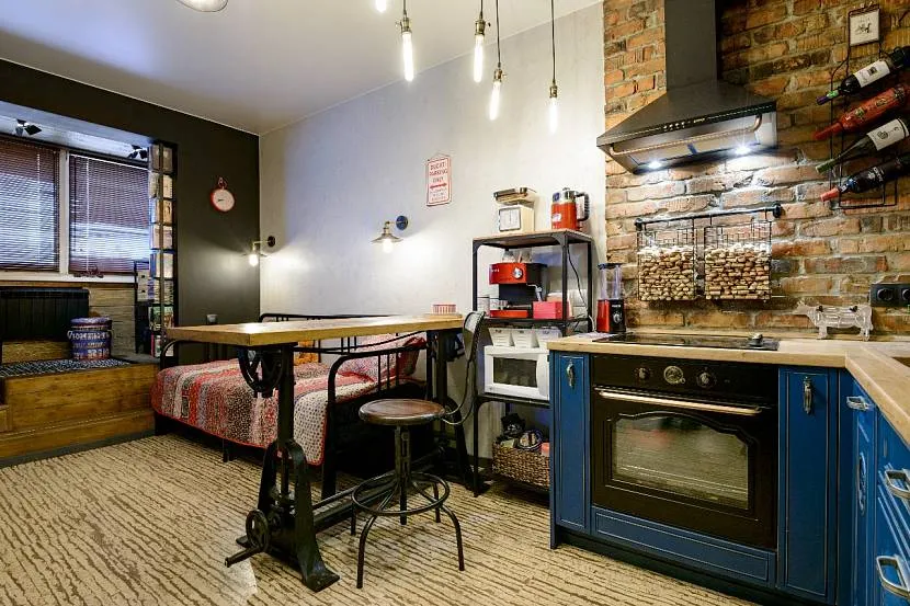 Кирпичная кладка, коммуникации на стенах и потолке, балки, промышленные вентиляторы, металл и грубо обработанное дерево – все это стиль лофт. Здесь встречаются непривычные вещи: современная бытовая техника и потертая мебель, самодельные тумбы из поддонов, бетонные светильники и металлический декор. Воспринимается такой стиль легким и свободным при всей своей брутальности.