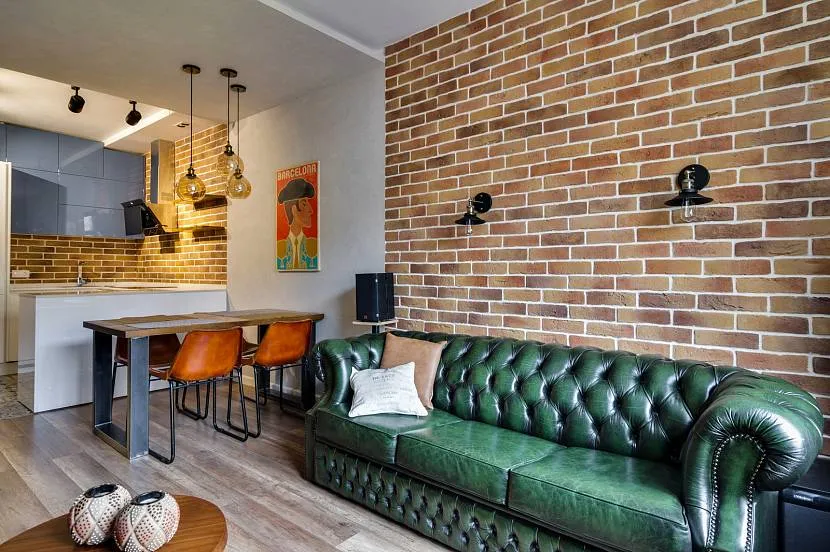 Зонирование кухни-гостиной 17 кв. м. можно сделать с упором на разную текстуру материалов. В одной зоне будут рельефные обои, в другой – обычные однотонные.