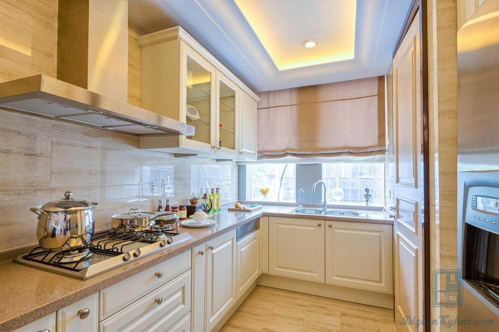 Интерьер кухни в частном доме с двумя окнами на разных стенахДизайн кухни с большими окнами на разных стенах для типичной современной семьи, может быть выполнен в духе романтичного классицизма. Примечательная деталь такого интерьера: тяжелые портьеры, которые редко встретишь на кухнях 2017 года.
