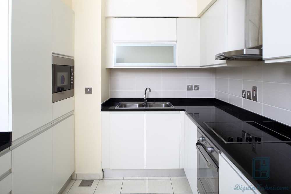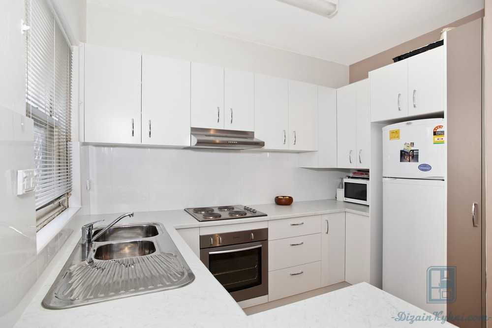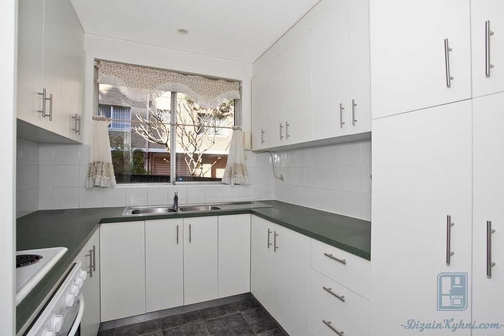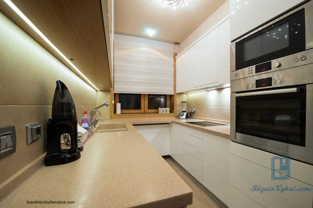 Небольшие наборы мебели, размещенные в ряд, могут располагаться под окошком, на прилегающей, противоположной стене. Минус встроенной однорядной мебели — в сокращении места хранения. Верхний ряд шкафов придется убрать полностью или, как минимум, исключить ящики по ширине проема.