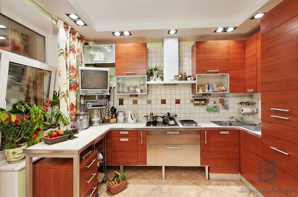 Отличается компактностью, поэтому хорошо подходит для малогабаритного жилья. В углу можно установить мойку возле окна, а шкафчик под столешницей сделать скошенной формы, чтобы получилось больше полезного места. В нише под окном оборудуют также тумбу для хранения.