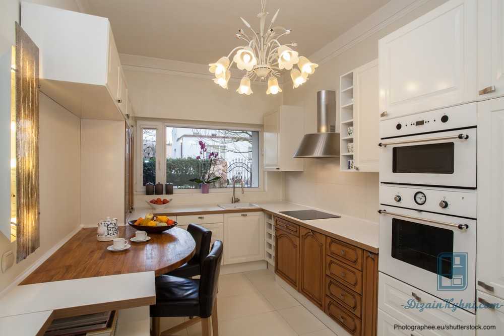 Здесь проем можно завесить светлыми шторками, из полупрозрачной ткани, либо приобрести тюль. Хорошо будут смотреться обычные жалюзи. В небольшой кухне упор нужно делать на экономию пространства, поэтому из подоконника следует сделать столешницу, под которой установить места для хранения.